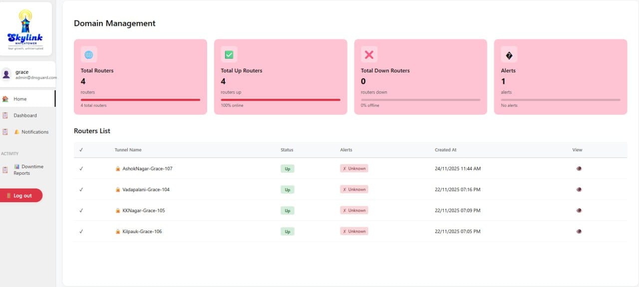 The Router Status Overview provides a quick snapshot of the health and connectivity of all routers in your domain. It shows which routers are online, if any are offline, and highlights alerts that may need attention—helping you understand the stability of your entire network at a glance.