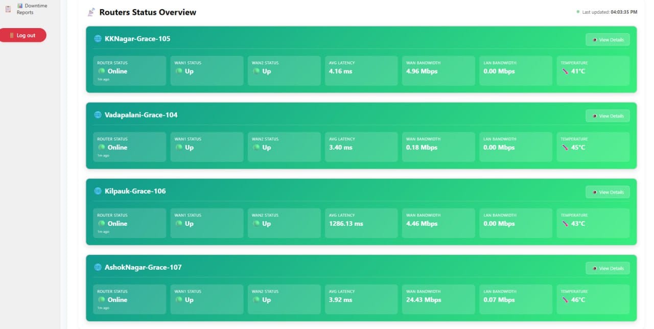 - The router monitoring dashboard provides real-time visibility using Zabbix, showing router status, WAN1/WAN2 connectivity, temperature, average latency, and bandwidth usage for both WAN and LAN.